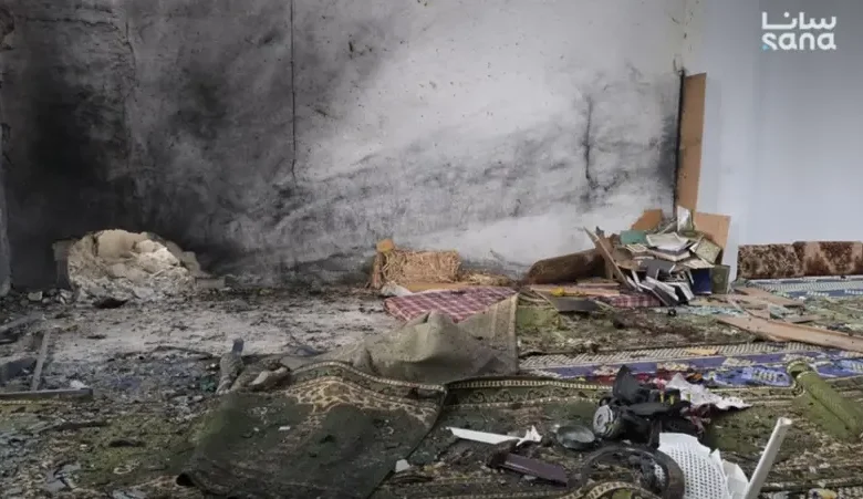 نشرت وكالة “سانا” صورًا من داخل المسجد المستهدف، أظهرت الأضرار الجسيمة التي لحقت بأحد الجدران، مع تصاعد الدخان الأسود وتبعثر السجاد والكتب داخل أروقة المسجد، في مشهد يُظهر شدة الانفجار.