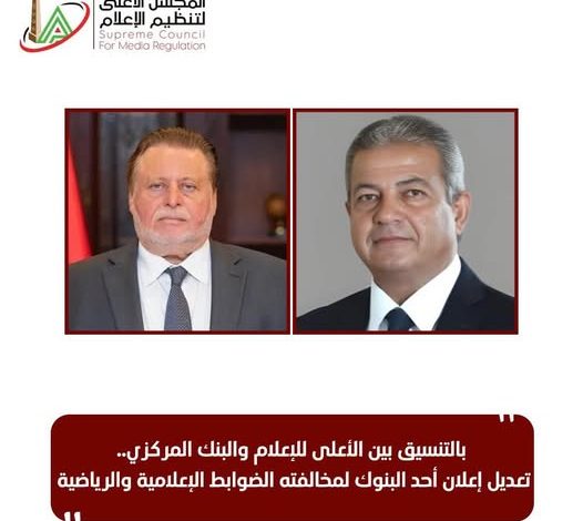 الأعلى للإعلام يوجه بتعديل فوري لإعلان مصرفي بالتنسيق مع البنك المركزي
